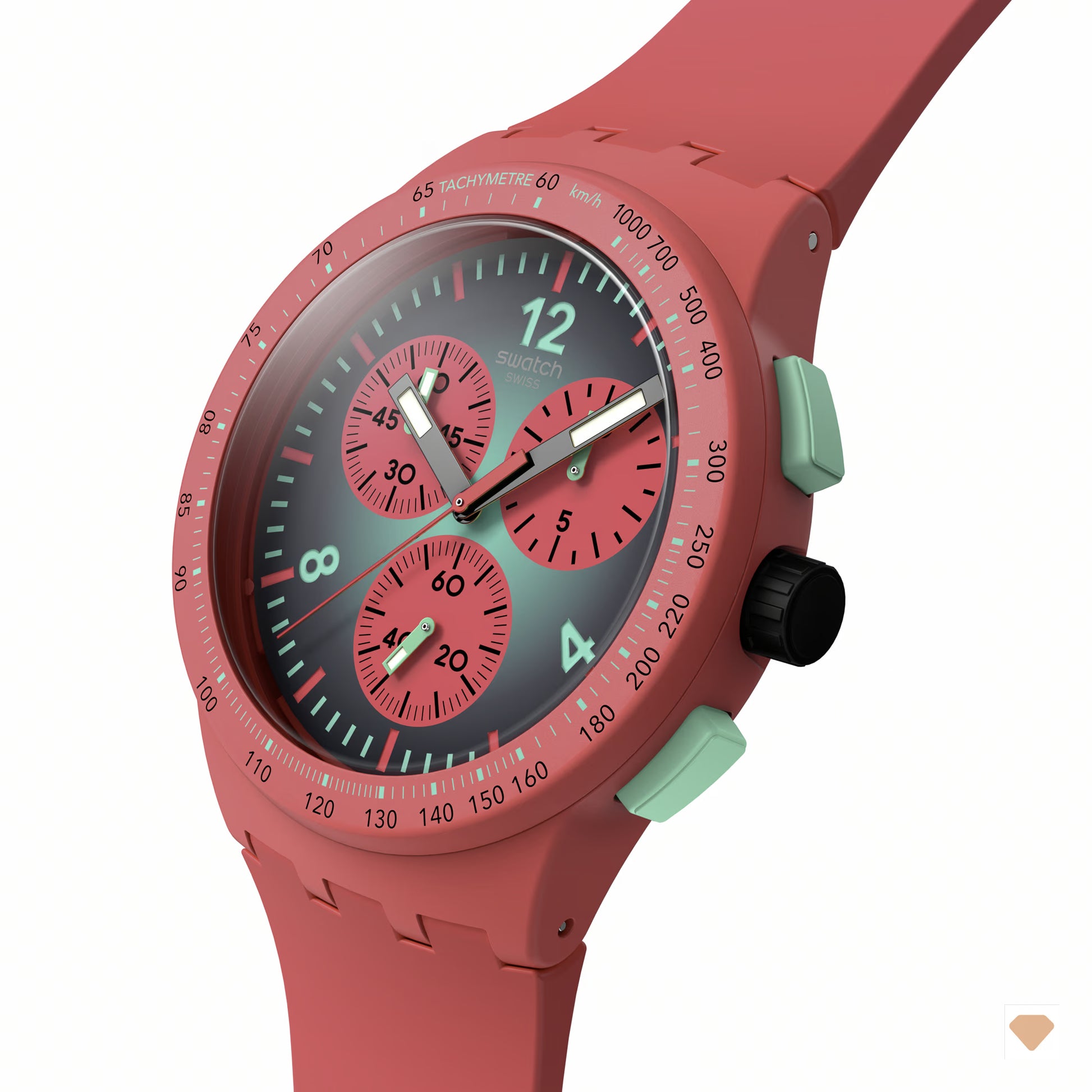 The sporty BLACK-ONE (SUSB416) with chronograph functions stylishly ups the ante. Push buttons, crown and subdials are in blue, red and yellow.
