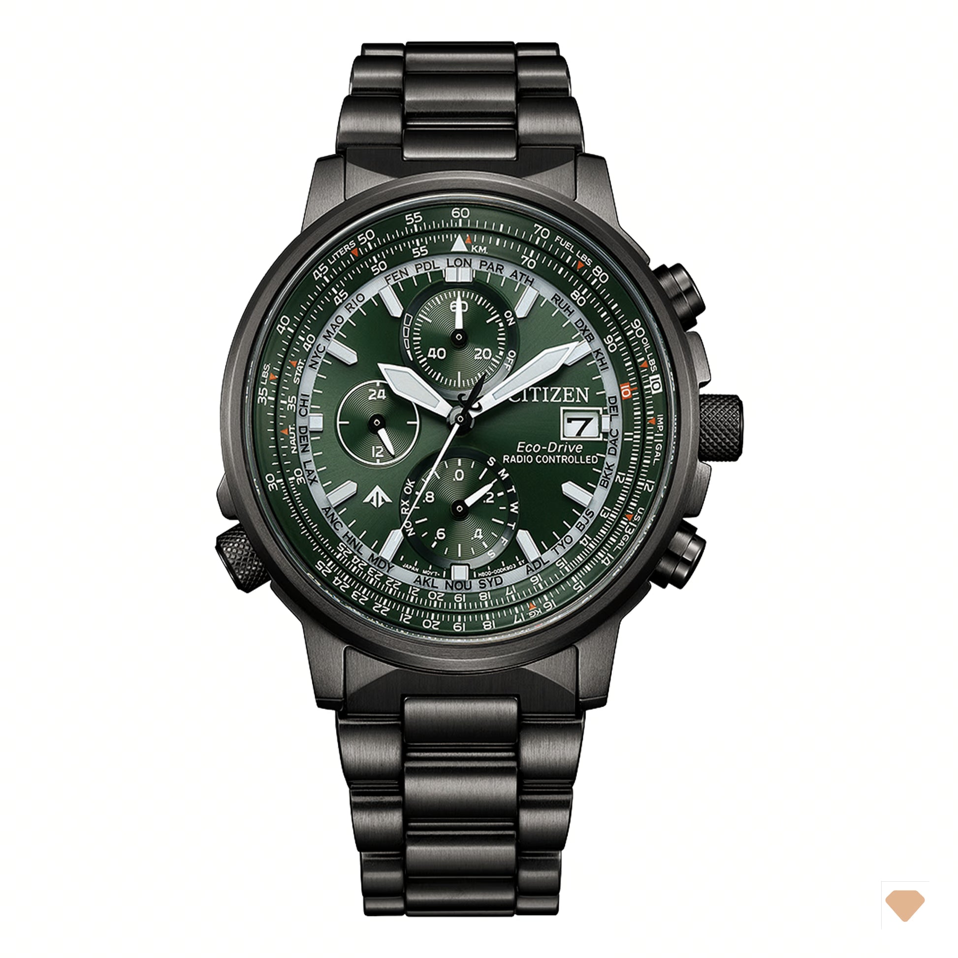 Entdecken Sie die Citizen Promaster Sky mit dem präzisen Eco-Drive Kaliber H800. Dieses silberfarbene Edelstahlgehäuse von 41 mm Durchmesser und 11,62 mm Höhe beherbergt einen analogen Chronographen mit umfangreichen Funktionen: 24-Stunden-Anzeige, Antimagnetismus, Batterie-Entladungsanzeige, ewiger Kalender sowie Stoppuhr bis 60 Minuten mit 1/20-Sekunden-Genauigkeit. Die Funkuhr synchronisiert sich weltweit (EUR, JPY, USA, China) und bietet Zeitzonen für 26 Städte sowie World Time. Das entspiegelte Saphirglas schützt das grüne Zifferblatt mit klaren Strichindizes. Das massive Edelstahlband verfügt über eine sichere Double-Push-Schließe. Mit einer Wasserdichtigkeit von 20 bar und einer Gangreserve von bis zu 180 Tagen ist diese Uhr ein zuverlässiger Begleiter für jeden Tag – ganz ohne Batteriewechsel.