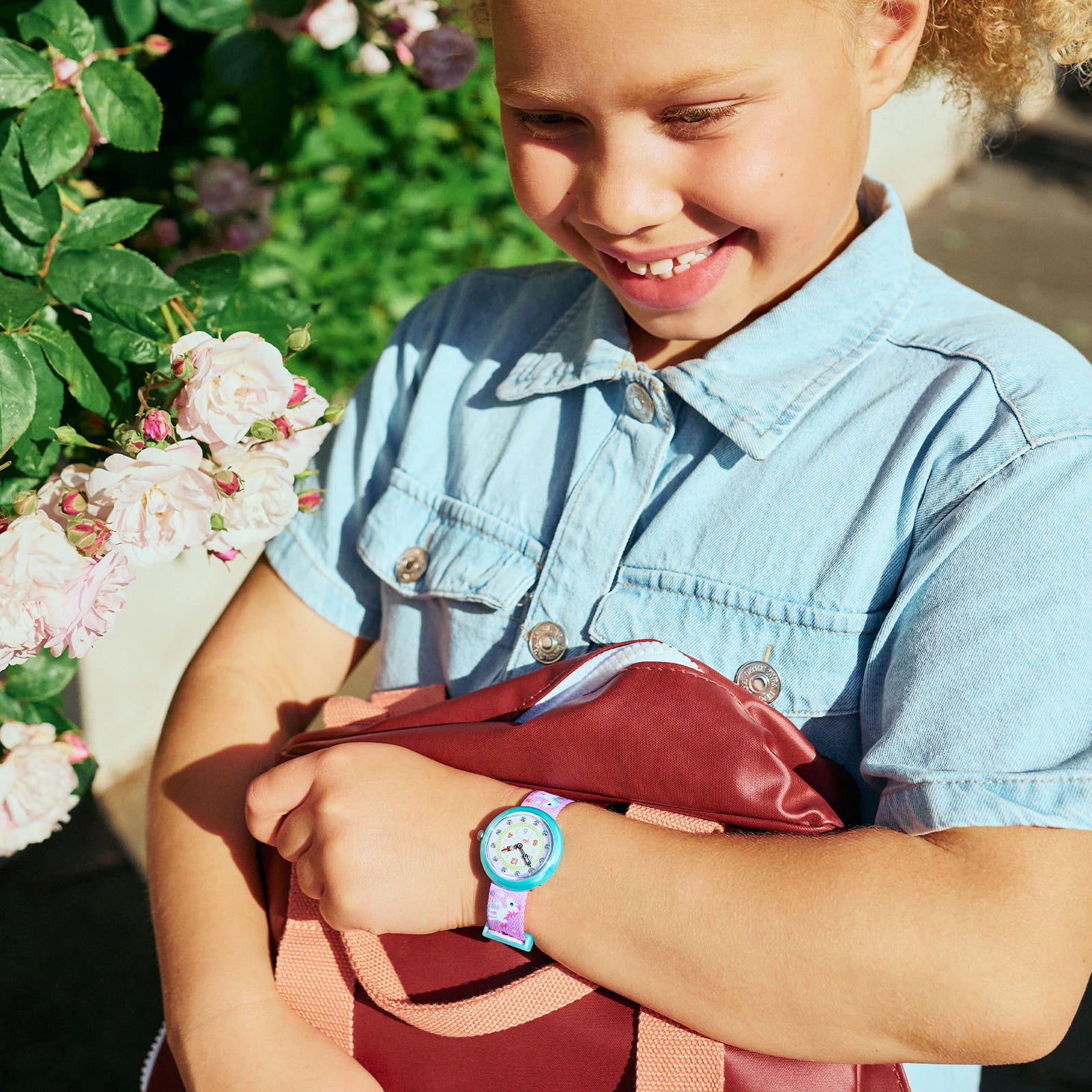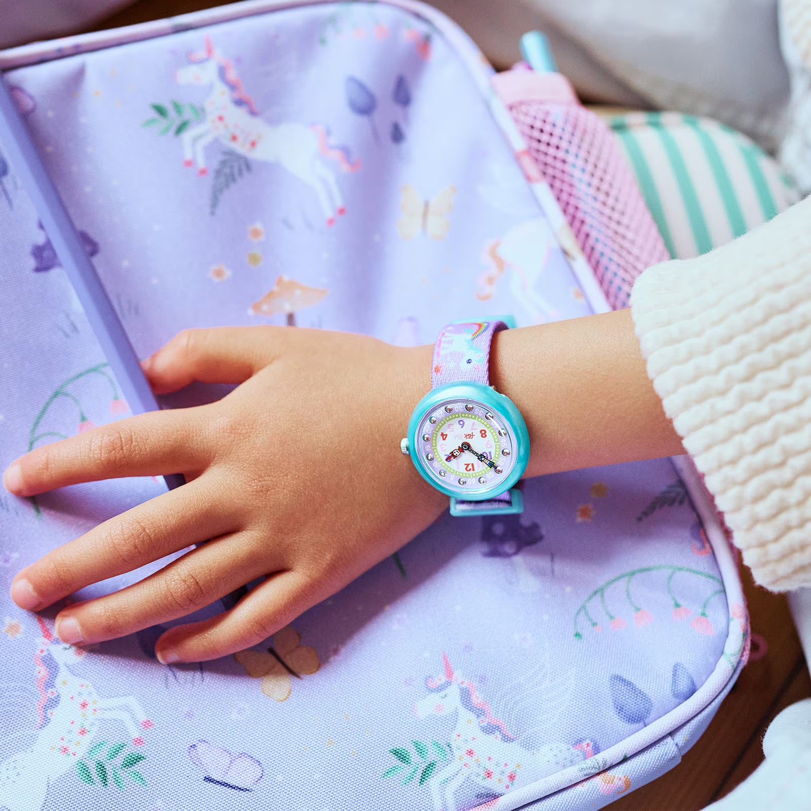 Verschenke die lehrreiche MAGICAL UNICORNS Kinderuhr mit einem lila Zauberwald, Hoppelhäschen und einem farbenfrohen Regenbogen, damit die Kleinen das Uhrenlesen lernen.