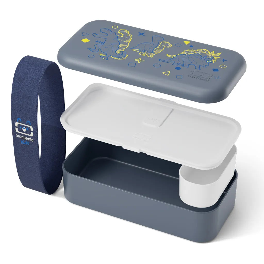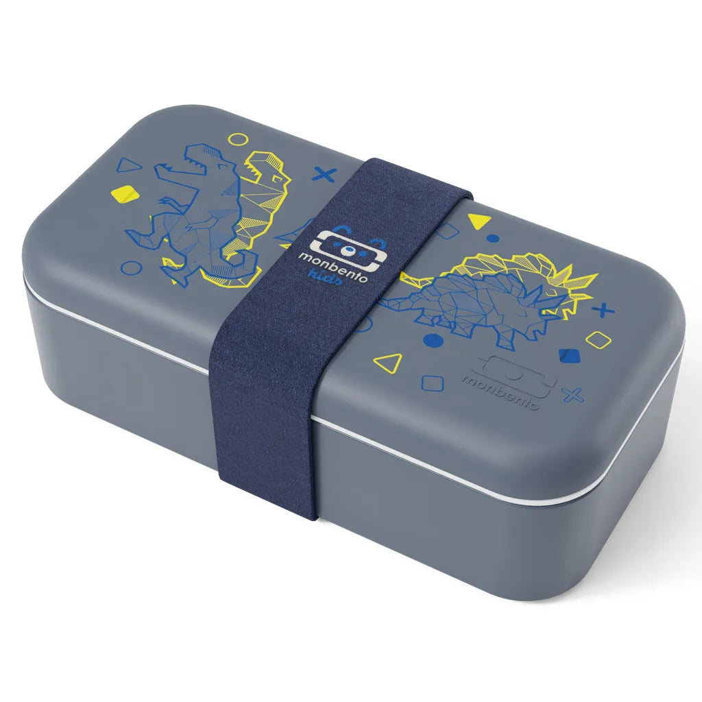 Das DINO DINER Geschenkset für Kinder enthält eine lehrreiche Kinderuhr sowie eine monbento-Brotdose. Auf beiden finden sich bunte Dinosaurier – das perfekte Geschenk für kleine Dino-Fans.