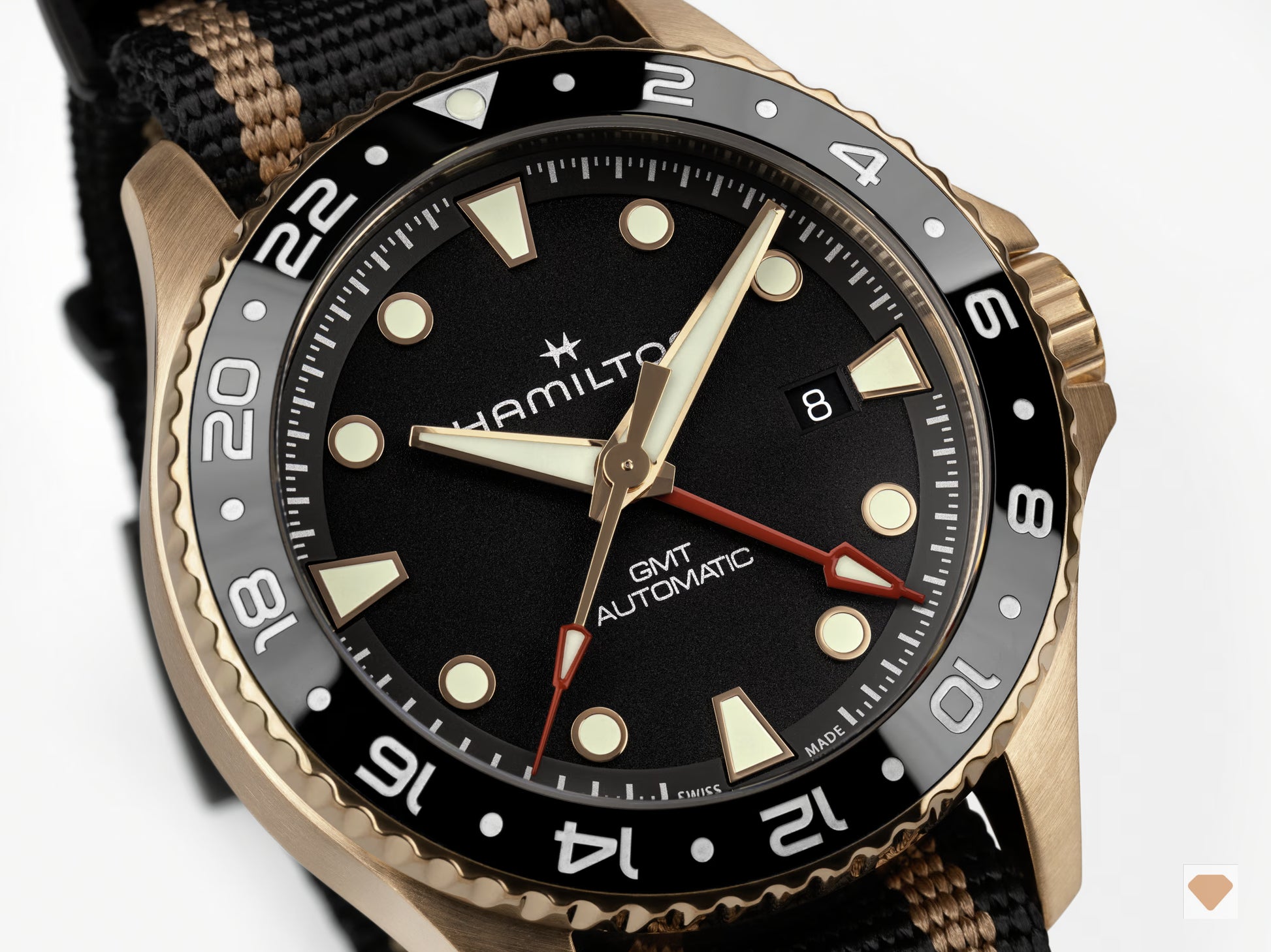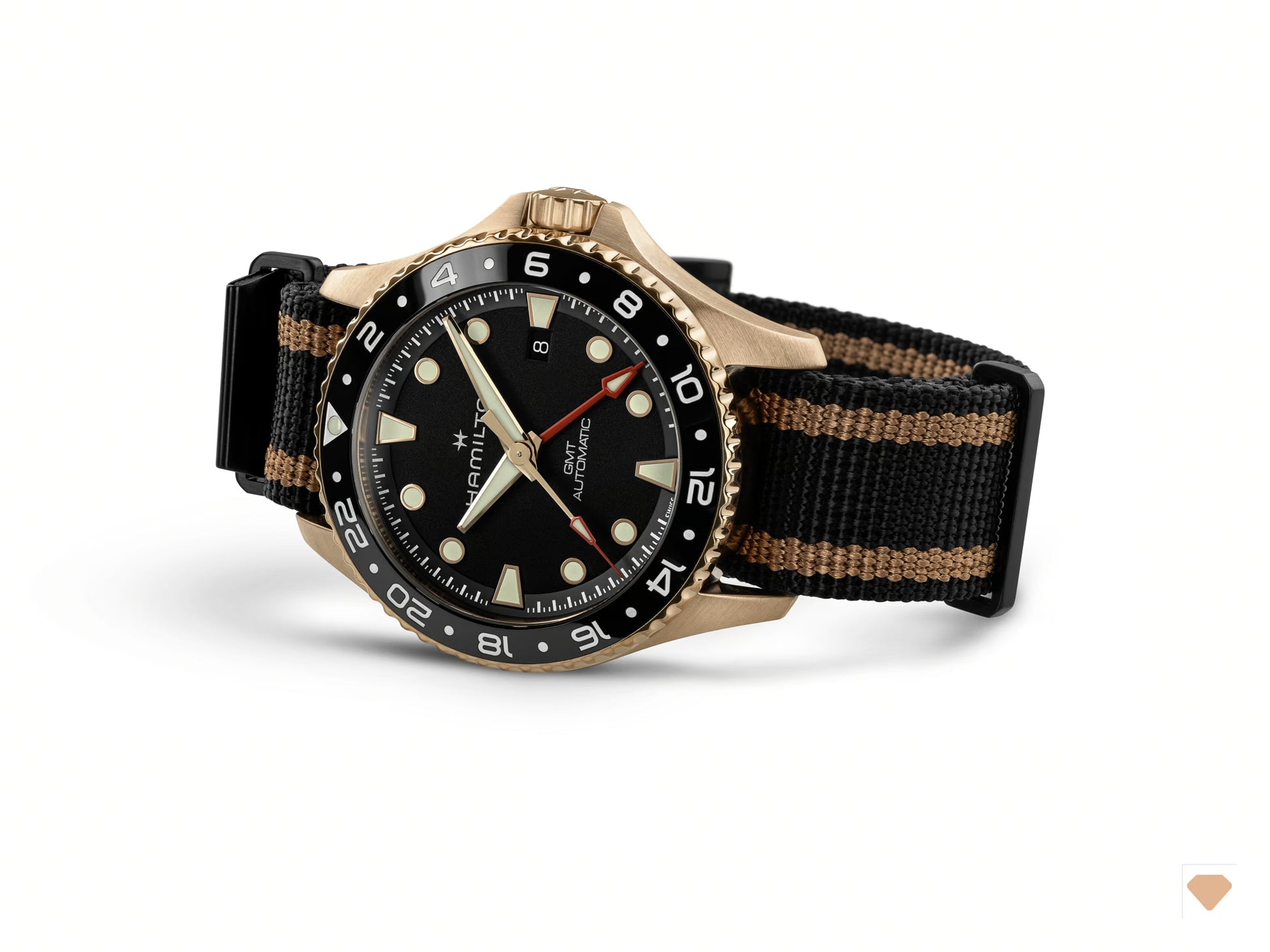 Die Khaki Navy Automatic GMT wurde für moderne Matrosen und alte Seebären entwickelt und ist dank ihrer präzisen Angabe der Uhrzeit in mehreren Zeitzonen die ultimative Uhr für Globetrotter. Das schwarze Zifferblatt mit dem bronzefarbenen Gehäuse und dem schwarz-goldenen NATO-Armband wird von hellgrünen Super-LumiNova®-Indexen akzentuiert, während ein roter Zeiger die GMT-Funktion anzeigt und das Ablesen der zweiten Zeitzone erleichtert. Mit einer Wasserdichtigkeit von 30 bar, einer verschraubten Krone und einer Gangreserve von bis zu 80 Stunden ist die Khaki Navy Automatic GMT ein stilvoller und zuverlässiger Begleiter auf Ihrem Weg zu neuen Horizonten.