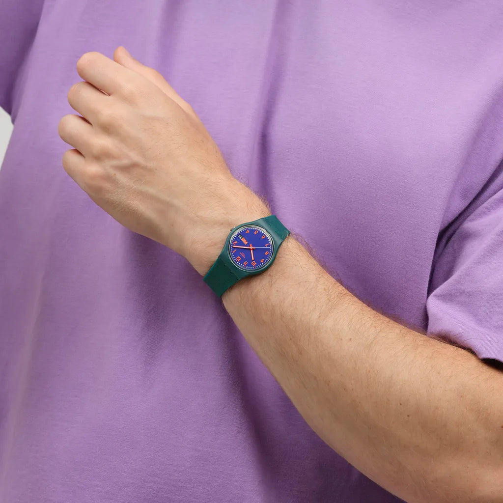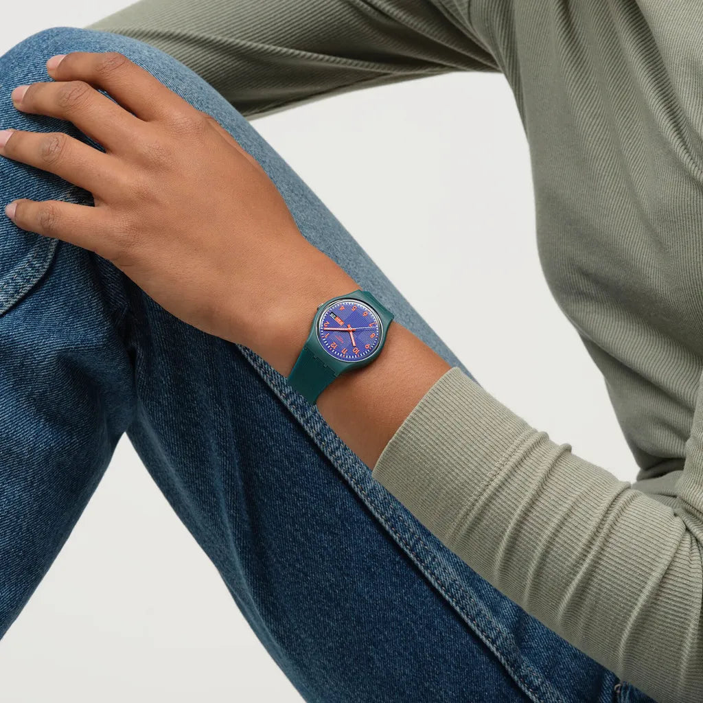 Diese Uhr besticht durch ein strukturiertes blaues Zifferblatt mit orange gedruckten Ziffern, einer Minutenteilung in Hellblau und Orange und einem Datumsfenster bei 3 Uhr. Orangefarbene, fluoreszierende Stunden- und Minutenzeiger und ein hellblauer Sekundenzeiger zeigen unter dem biobasierten Glas die Uhrzeit an. Das Gehäuse in mattem Dunkelgrün wird durch ein strukturiertes Armband in mattem Dunkelgrün, eine Schlaufe in mattem Blau und eine Schließe in mattem Dunkelgrün abgerundet.