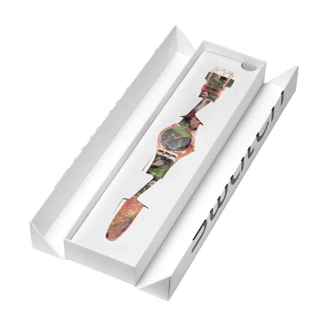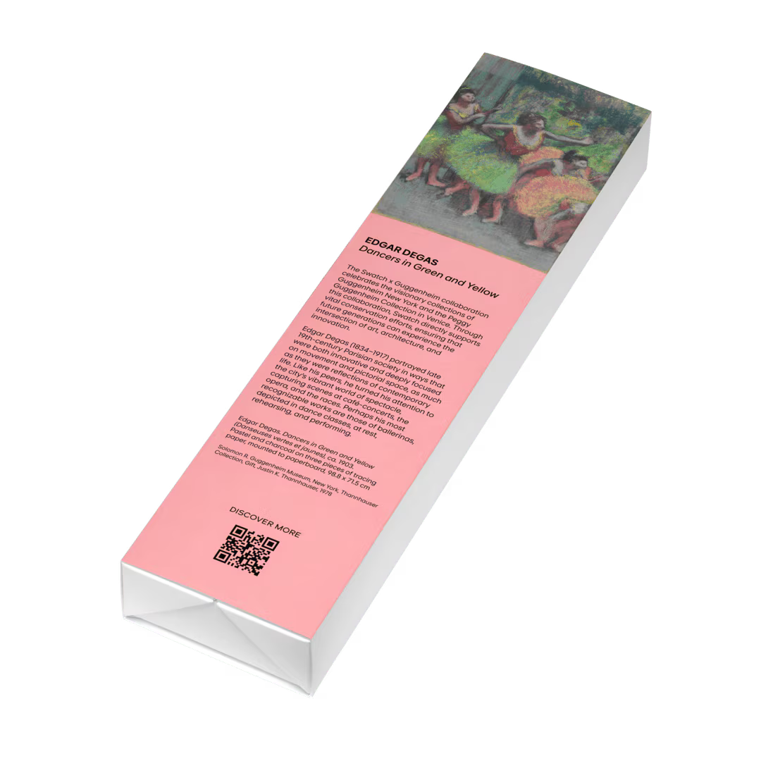 Diese Uhr aus der Swatch x Guggenheim Kollektion besticht durch ein biobasiertes Gehäuse in glänzendem Rosa und einem biobasierten Glas mit goldfarbenen Stundenmarkierungen. Das Zifferblatt und das transparente Armband in glänzendem Rosa sind mit einem Druck von Edgar Degas’ Kunstwerk „Dancers in Green and Yellow“ (Tänzerinnen in Grün und Gelb) versehen. Goldfarbene Stunden- und Minutenzeiger und ein weißer verlängerter Sekundenzeiger zeigen die Uhrzeit an. Die transparente mattrosafarbene Schlaufe ist mit dem Guggenheim-Logo bedruckt und rundet die Uhr zusammen mit der transparenten Schließe in glänzendem Rosa ab. Edgar Degas, Dancers in Green and Yellow, ca. 1903