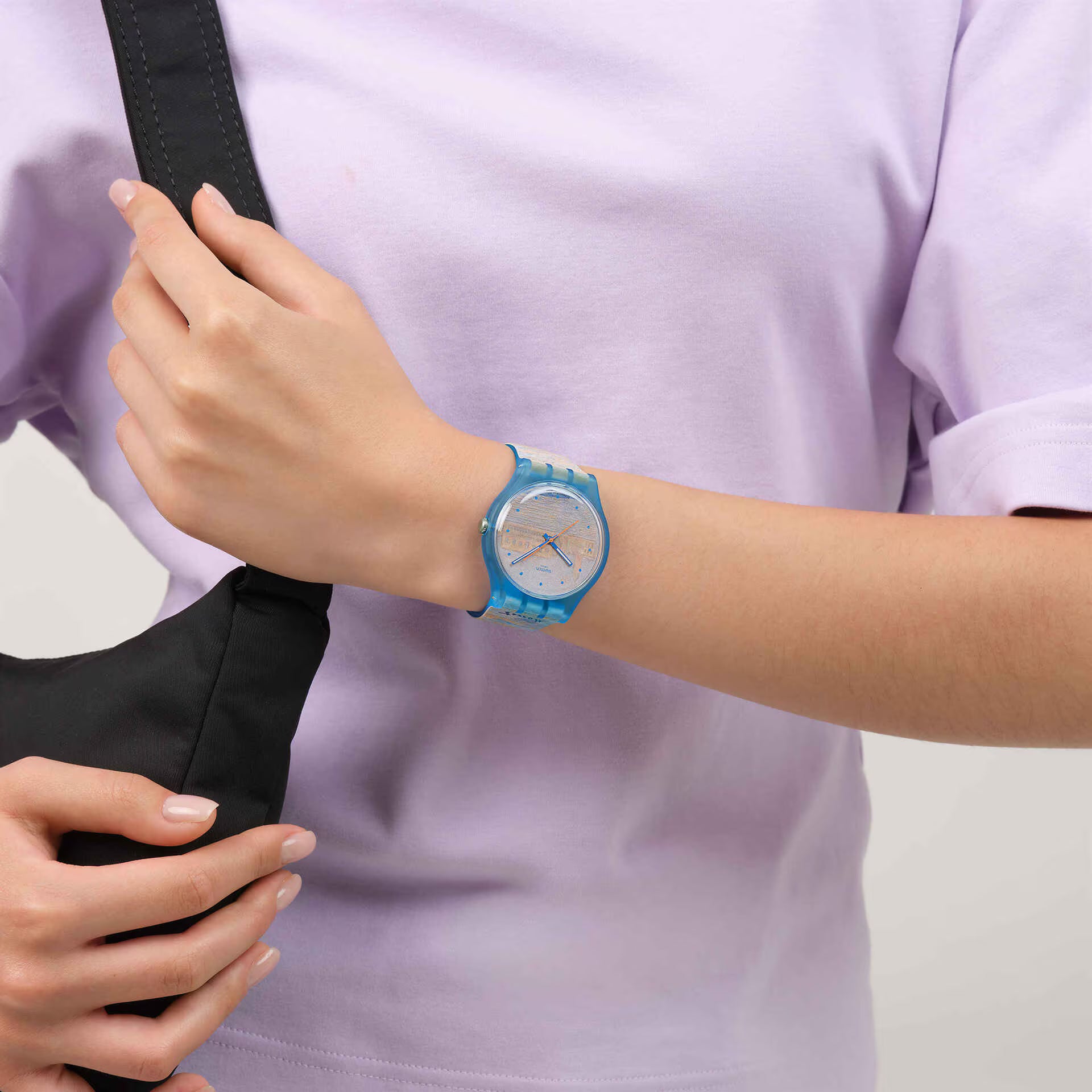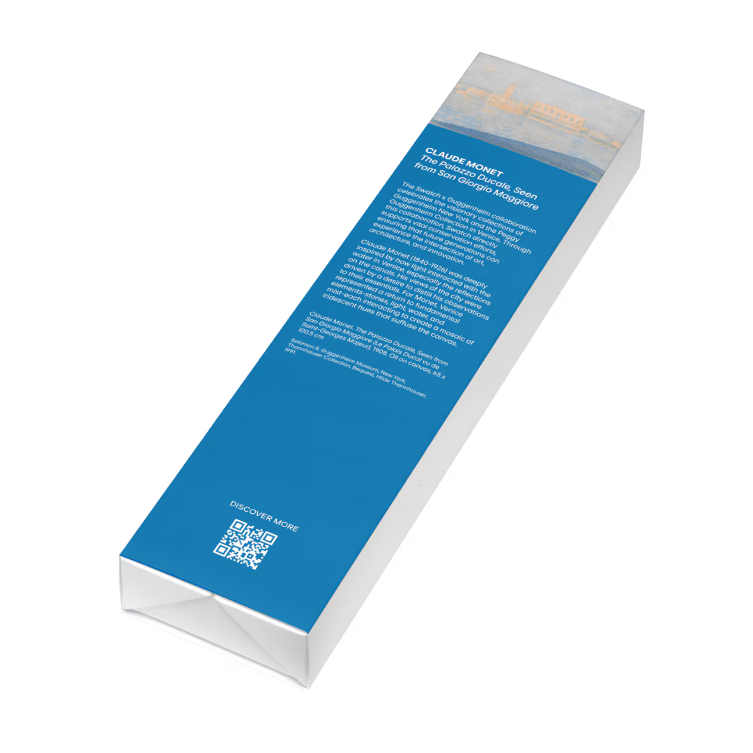 Diese Swatch Pay Uhr aus der Swatch x Guggenheim Kollektion verfügt über ein transparentes biobasiertes Gehäuse in Mattblau mit biobasiertem Glas. Das Zifferblatt und das transparente mattblaue Armband sind mit einem Druck von Claude Monets Kunstwerk „The Palazzo Ducale, Seen from San Giorgio Maggiore“ versehen. Der mehrfarbige Druck auf dem Zifferblatt leuchtet unter UV-Licht orange. Fluoreszierende blaue Stunden- und Minutenzeiger und ein verlängerter orangefarbener Sekundenzeiger zeigen die Uhrzeit an. Die transparente mattblaue Schlaufe ist mit dem Guggenheim-Logo bedruckt und rundet gemeinsam mit der transparenten mattblauen Schließe die Uhr ab. Claude Monet, The Palazzo Ducale, Seen from San Giorgio Maggiore, 1908