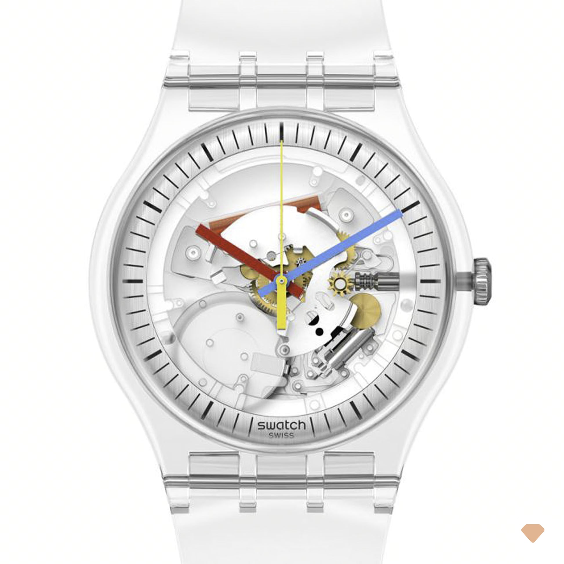 Ein silberfarbener Ring glänzt auf dem Zifferblatt dieser transparenten Uhr mit Zeigern in Rot, Blau und Gelb und Indizes in Schwarz. Ein glänzendes, biobasiertes Gehäuse und ein transparentes TPU-Armband runden das Design ab.