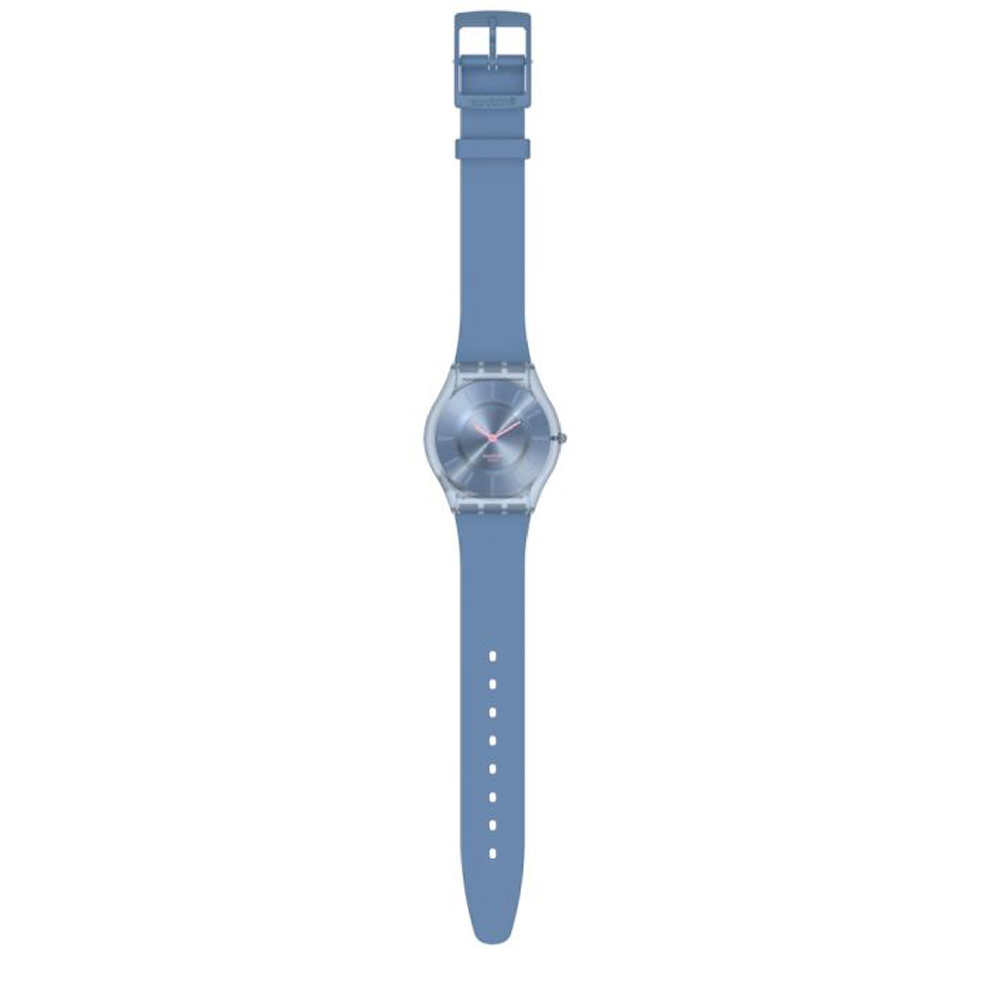 Diese auffallend schlanke Uhr mit biobasiertem Gehäuse kommt mit einem Swatch Logoprint in Pink auf einem sanftblauen Zifferblatt mit Sonnenschliff und pinken Zeigern. Die Farbe des Armbands, der Schlaufe und der Schließe wurde auf das Zifferblatt abgestimmt.