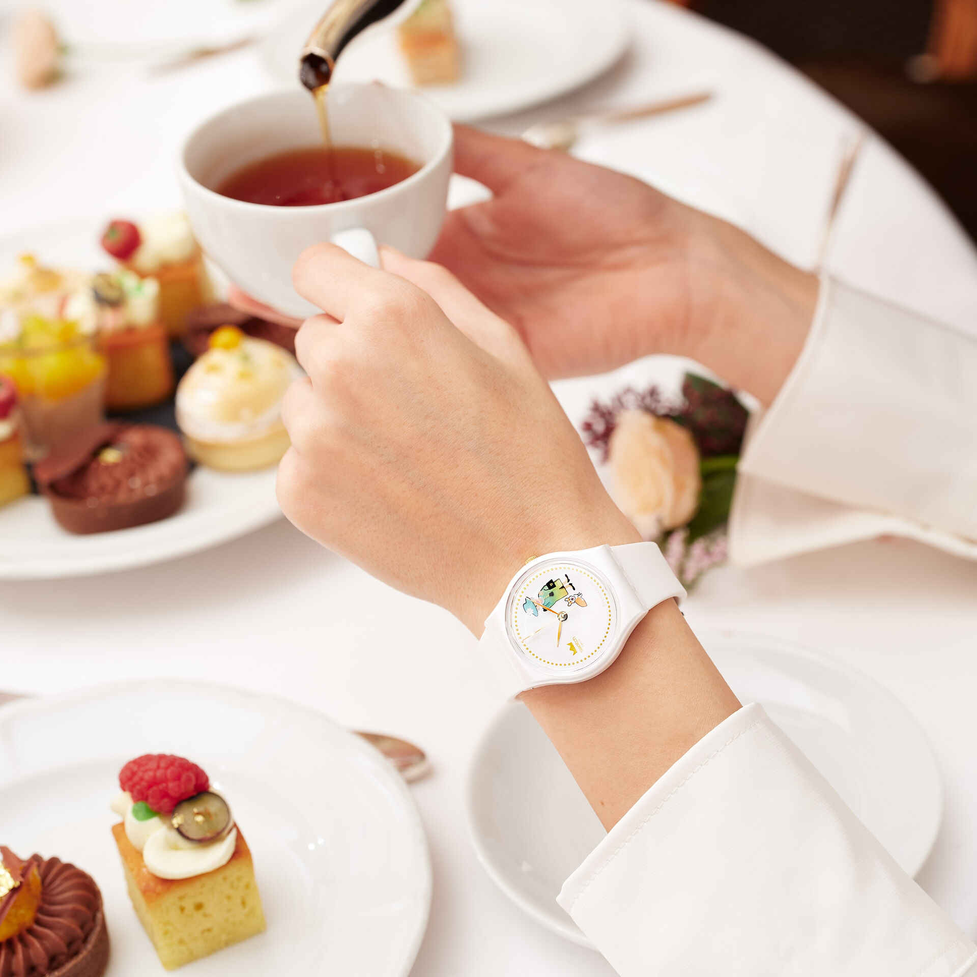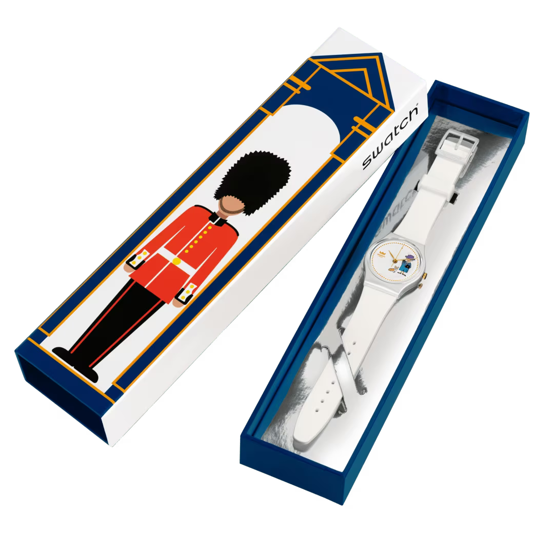 Diese Gent Uhr zeigt 70 goldfarbene Punkte auf dem Zifferblatt, die für das 70-jährige Thronjubiläum der Queen stehen. Der Clou an dieser Uhr ist das Farbwechsel-Kalenderrad, das dem Outfit der Queen jeden Tag stufenweise einen anderen Look gibt. Das Gehäuse und ein Silikonarmband in Mattweiß mit Anodamazing-Effekt vervollständigen das Design. Die Sonderverpackung enthält außerdem eine kleine Überraschung – eine glitzernde, silberfarbene Papierkrone.
