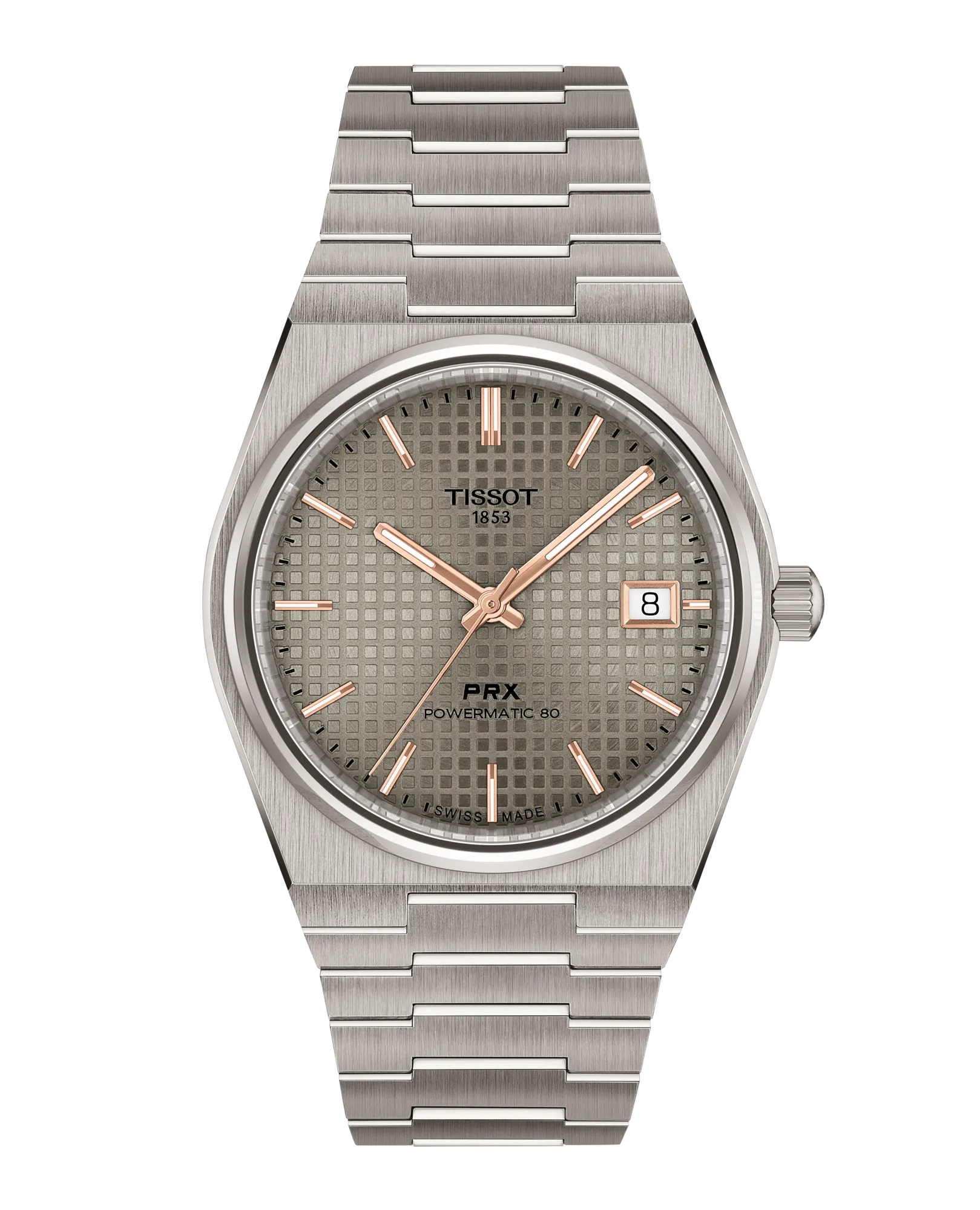 Dieses Tissot PRX 38mm Modell besitzt ein leichtes Titangehäuse mit 38 Millimetern Durchmesser. Roségoldfarbene Zeiger und Indizes heben sich kontrastreich von seinem anthrazitfarbenen Waffelzifferblatt mit Datumsanzeige ab. Es liegt gut geschützt unter kratzfestem, entspiegeltem Saphirglas. Durch den Mineralglas-Sichtboden lässt sich das unermüdlich arbeitende Uhrwerk beobachten.