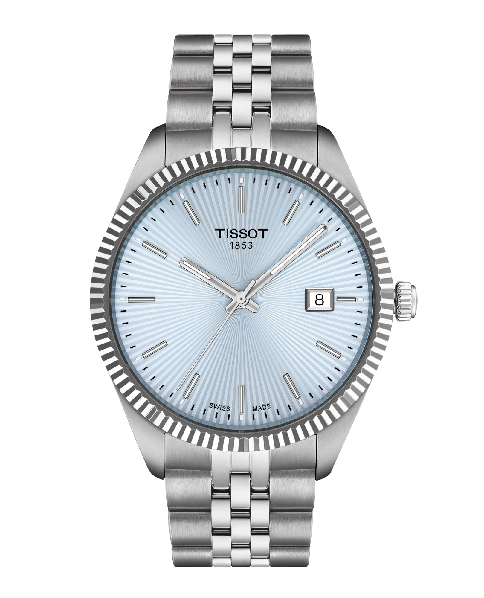Diese Ausführung der Tissot Ballade 40mm besitzt ein präzises Quarzwerk, ein 316L-Edelstahlgehäuse sowie kratzfestes, entspiegeltes Saphirglas. Dieses liegt schützend über dem eisblauen Zifferblatt mit Sonnenstrahl-Effekt und einer Datumsanzeige bei 3 Uhr.