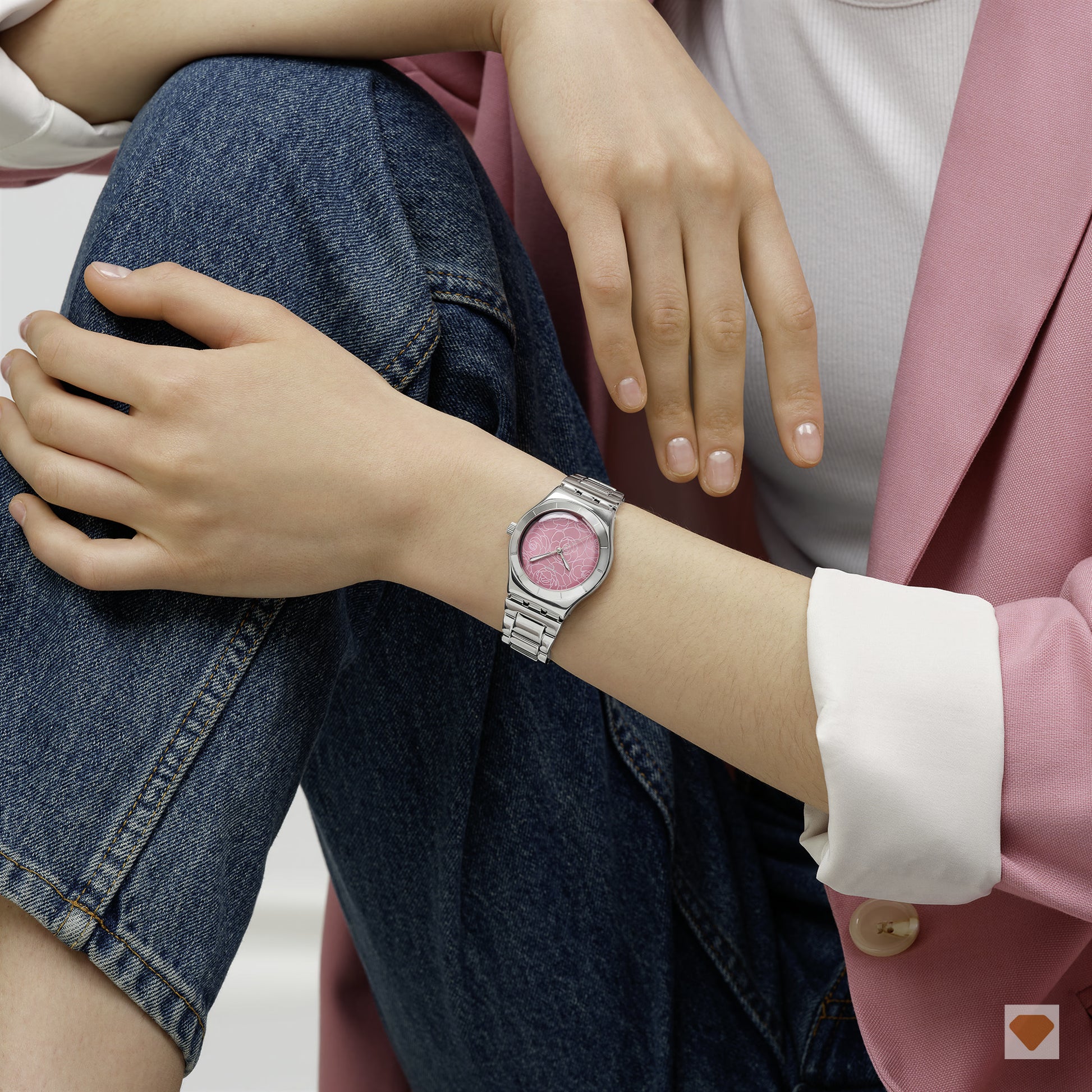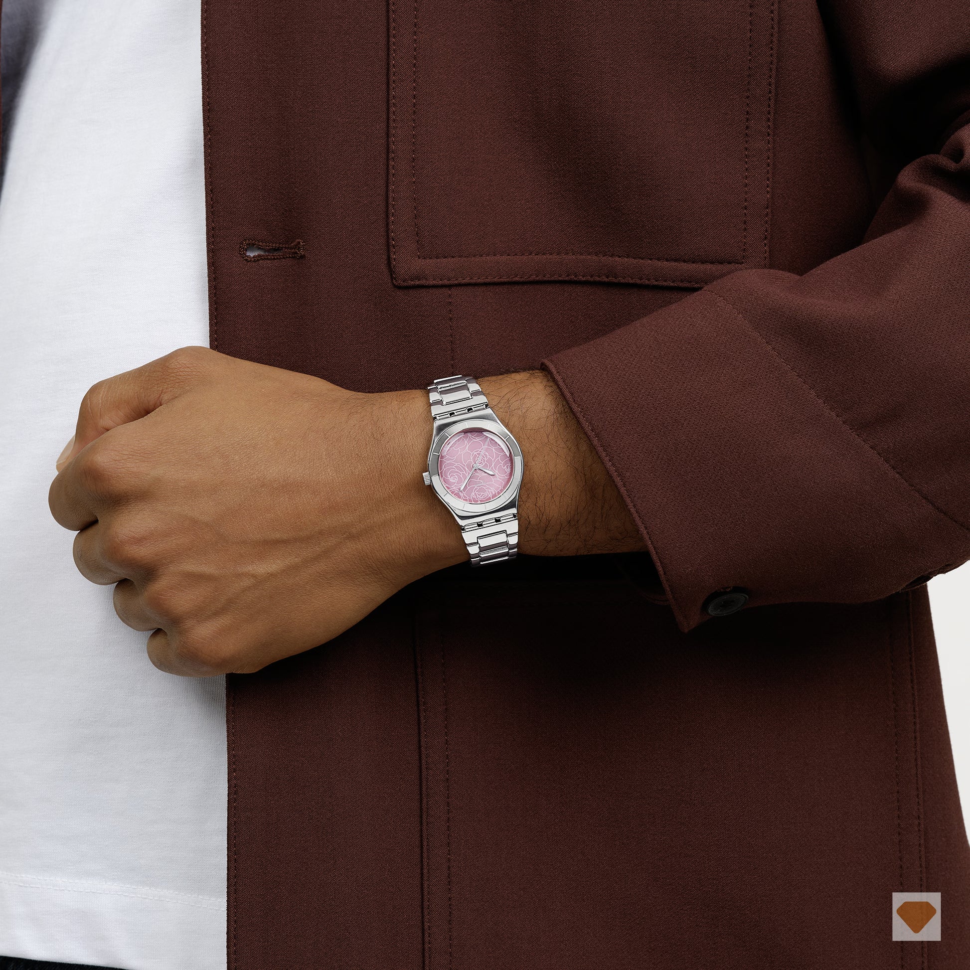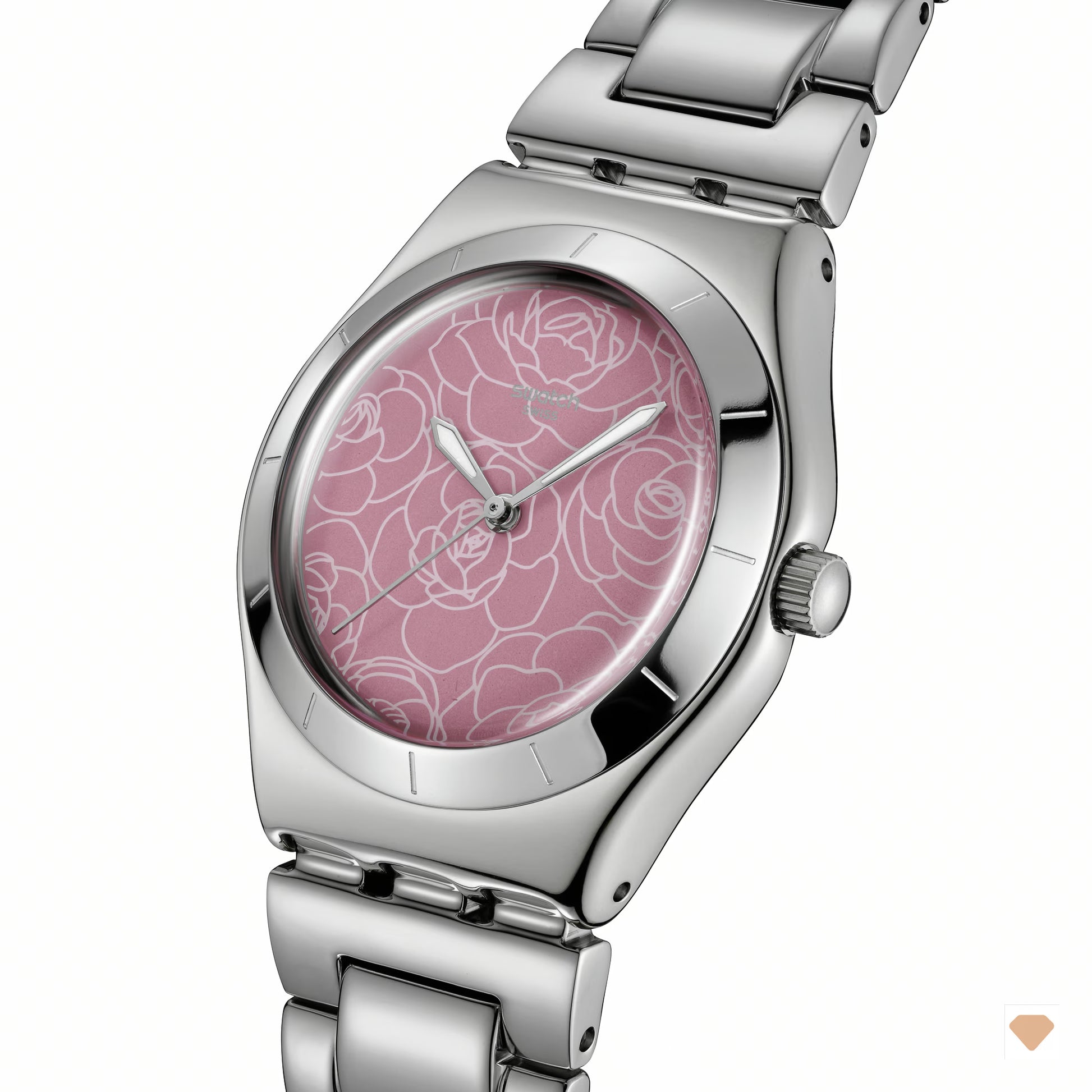 Dieser elegante Zeitmesser aus Edelstahl verfügt über ein Zifferblatt mit Sonnenschliff in Pink. Auf dem Zifferblatt sehen wir ein pinkes Blumenmuster, silberfarben fluoreszierende Stunden- und Minutenzeiger und einen silberfarbenen Sekundenzeiger. Das Gehäuse der Uhr besteht aus poliertem Edelstahl und die passende Lünette zeigt gravierte Stundenmarkierungen. Abgerundet wird der Look durch ein Edelstahl-Armband mit Doppelfaltschließe.