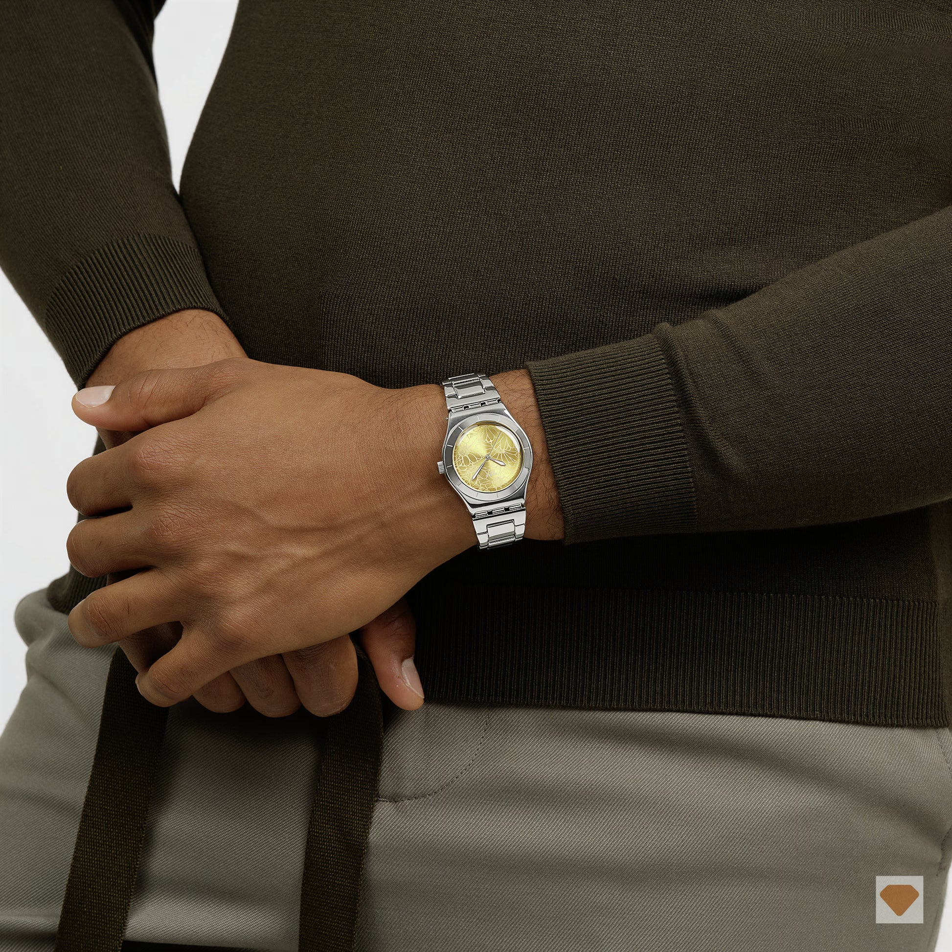 Dieser elegante Zeitmesser aus Edelstahl verfügt über ein Zifferblatt mit Sonnenschliff in Gelb. Auf dem Zifferblatt sehen wir ein gelbes Blumenmuster, silberfarben fluoreszierende Stunden- und Minutenzeiger und einen silberfarbenen Sekundenzeiger. Das Gehäuse der Uhr besteht aus poliertem Edelstahl und die passende Lünette zeigt gravierte Stundenmarkierungen. Abgerundet wird der Look durch ein Edelstahl-Armband mit Doppelfaltschließe.